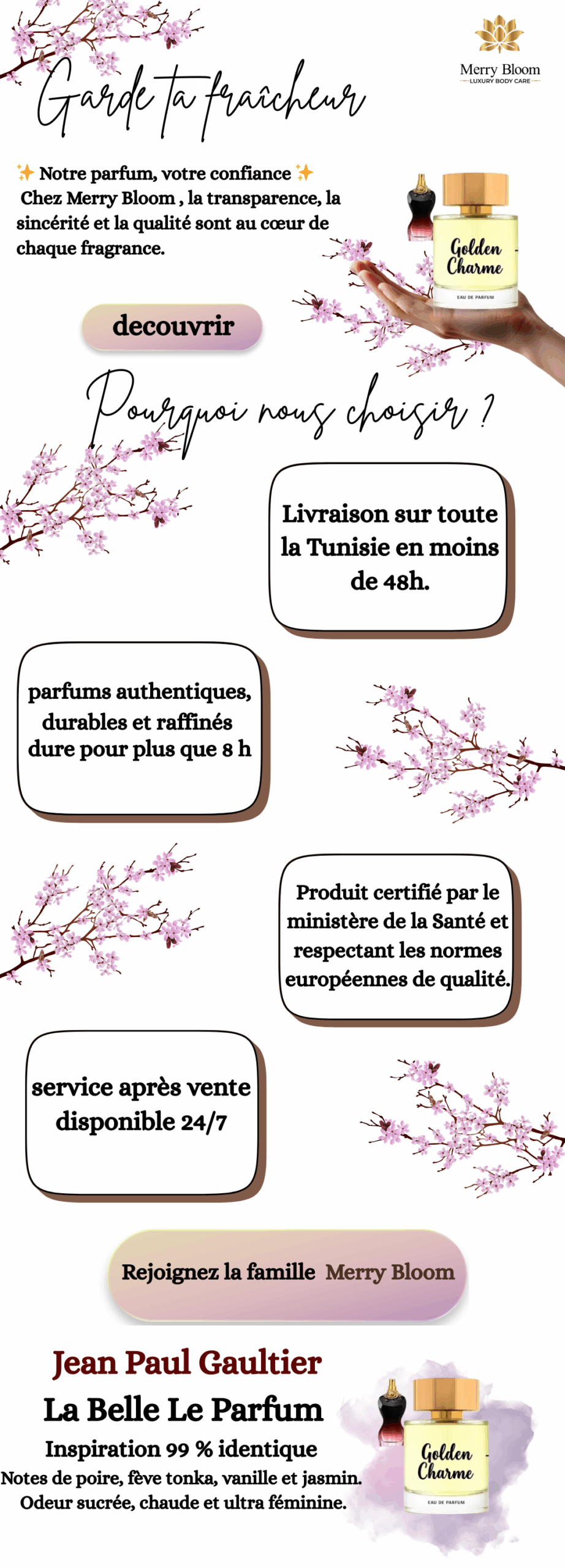 Golden Charm est une eau de parfum intense, gourmande et ultra féminine, inspirée de La Belle Le Parfum de Jean Paul Gaultier. C’est un parfum oriental-gourmand chaud, sucré et très séduisant, parfait pour celles qui aiment les fragrances enveloppantes et sensuelles.